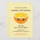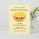 This sweet birthday party invitation for kids features a cute and kawaii happy face orange cartoon. The background is white polka dots on pastel yellow.