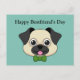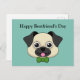 An illustration of a cute cartoon happy pug dog with green papillon for bestfriend and pet day. This adorable animal design is a gift idea for puppy lovers and dog with breed lovers.