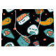 Cute funny happy seamless sushi pattern on black background