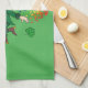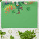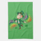 Kitchen Towel with an Illustration of a cute happy smiling and dancing leprechaun, he's wearing a green suit and a top hat and is surrounded by rainbow-colored splashes