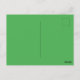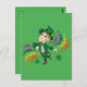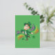 Postcard with an Illustration of a cute happy smiling and dancing leprechaun, he's wearing a green suit and a top hat and is surrounded by rainbow-colored splashes