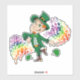 Vinyl Sticker with an Illustration of a cute happy smiling and dancing leprechaun, he's wearing a green suit and a top hat and is surrounded by rainbow-colored splashes