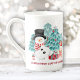Cute Christmas Bone China Mug with an adorable happy snowman, bunny and Christmas tree in snowy forest. You can easily personalize the text. - Kate Eden Art