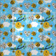 Super cute fabric patterned with happy smiling bumblebees, beehives, honeycomb and flowers over a blue summer sky