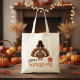 This fun double-sided tote bag features a cute turkey donning a pilgrim hat with the words "Happy Thanksgiving" in a fun brown and orange script.