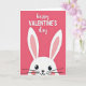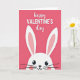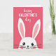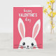 This Valentine’s Day card features a white bunny peeking up from the bottom edge, as if it’s popping in to say hello. The bunny has long ears with soft pink inside, wide dark eyes, and gentle pink cheeks that give it a sweet, slightly shy look. Small whiskers and a tiny mouth add to its friendly expression. The background is a bold fuchsia pink that makes the bunny stand out and sets a romantic mood. Across the top, the message reads “happy VALENTINE’S day,” with flowing script for “happy” and “day,” and clear uppercase lettering for “VALENTINE’S.” It’s a warm, cheerful card that suits romance, affection, or close friendship.