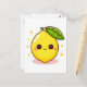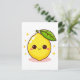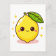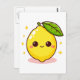 Cute happy yellow lemon with big round eyes and a happy smile. A single green leaf on the top of her head, with lots of sparkles and a pink shadow.