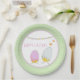 NewParkLane - Easter paper plates, with two cute Easter chicks just hatched out of their egg shells in pastel pink and purple and one in soft blue. With two cute little orange butterflis and a pastel colored bunting flag. With a frame with a pink border against a pastel green and white polkadot background.