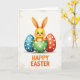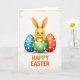 This card features a bright yellow, cartoon-style bunny-like creature 🐰 with tall, expressive ears, peeking up from a jagged, broken green egg covered in white dots. Its wide dark eyes and rosy cheeks pair with an open smile, giving it the look of greeting someone it’s happy to see, like a small affectionate surprise. On either side sit two large eggs—one cool blue and one warm red—each decorated with neat white spots that mirror the green shell and create a friendly, matched-together trio. The background is an off-white, lightly textured field that resembles fine paper, keeping the focus on the central figures while adding a soft, cozy tone. Gentle lighting adds small shadows beneath the eggs, making them feel grounded and close, as if set side by side for a shared moment 🌷. Near the bottom, a short Easter message appears in orange lettering, centered under the illustration and easy to spot against the pale background. The green shell’s cracked edges frame the yellow character, while the blue and red eggs stand evenly spaced with crisp polka dots.