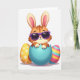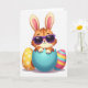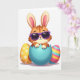 This greeting card shows a cute, humanlike bunny with long upright ears and soft orange fur peeking out of a freshly cracked blue eggshell 🐰. It wears purple-framed sunglasses, and the small curved smile and pink nose give it a friendly, flirty look, as if it’s sharing a private joke with someone nearby. The bunny’s little paws hold the jagged shell edges gently, adding a tender, careful touch to the moment. The background is plain white, keeping the focus on the bright spring colors and the smooth, rounded shapes. On the left sits a sunny yellow egg decorated with small white flower patterns, like a quiet nod to a sweet friendship 🌷. On the right is another egg wrapped in horizontal stripes of pink, golden yellow, and teal, stacked neatly from top to bottom. Near the top, a short Easter greeting appears in a simple font in a soft pastel tone, floating above the trio of eggs.
