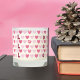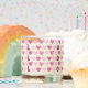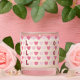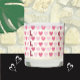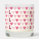 A cute scented candle jar with a fun little pink heart pattern and the letters "Love" spelled 3 times .
