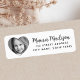 Cute photo return address labels featuring a heart shaped photo and template fields for your name and address on a white or custom color background. Name or family name in a whimsical script font. Change fonts and colors in the design tool.