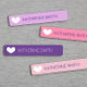 Cute and colorful labels with white hearts and your name or your child's name in modern fonts in shades of pink and purple.