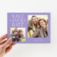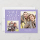 Simple and modern wedding save our date card featuring a text that says "Save Our Date" with hearts. 2 photos on the front and one on the back. The background is lilac.