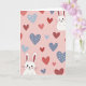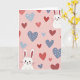 Designed with a soft blush pink background, this card features two cute cartoon bunnies peeking in from opposite corners. Each bunny is white with rosy cheeks, tiny dot eyes, and a small smile, and their long ears have light pink tips. Between them, lots of hearts are scattered across the card in different sizes, with reds, corals, and several shades of blue. Two standout hearts have small white polka dots—one red and one blue—which adds a fun little detail without feeling busy. The overall look is sweet and calm, like a simple moment of affection shared between friends or loved ones 💘❤️.