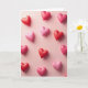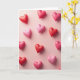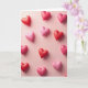 This greeting card features a soft pink background filled with puffy heart shapes scattered across the front. Each heart has smooth edges and a gentle shine, giving them a candy-like look that feels warm and inviting. The colors range from deep red to light blush pink, creating a cozy mix that draws your eye around the design. Subtle lighting adds small shadows beneath the hearts, making them appear slightly raised, as if they’re floating above the surface. There are no characters or words on the front, so the hearts become the full message. The overall look feels tender and romantic, perfect for sharing heartfelt Valentine’s Day feelings with someone special 💕❤️.
