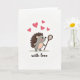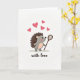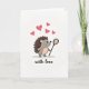 This card shows a cute hedgehog in the center on a plain white background. Its body is light gray with dark brown quills, and it has a pink belly and rosy cheeks that make it look sweet and friendly ❤️. The hedgehog has tiny dot eyes and a small black nose, and it’s holding a small brown badminton racket in front of it. Above its head, five pink hearts float upward, like they’re rising into the air with love 💘. Near the bottom of the card, the words “with love” appear in a dark-colored cursive style, easy to spot against the white space. The simple layout keeps your attention on the hedgehog, the hearts, and the message. It feels like a gentle way to say you care, whether it’s for a partner, friend, or family member 😘.