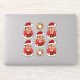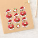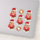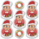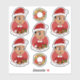 Set of seven cut-vinyl stickers with an illustration of a cute little happy smiling Hispanic/Latino boy with short black hair, who is dressed in Christmas clothes and is wearing a red Santa Claus hat, on a red background; five stickers of the boy and two stickers with a Christmas wreath; with a customizable text template for your name or message