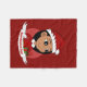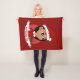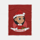 Throw blanket with an illustration of a cute little happy smiling Latina/Hispanic or Asian girl with long black hair, who is dressed in Christmas clothes and is wearing a red Santa Claus hat and holding a present; Christmas holidays design on a red background, with an editable text template for your name or message