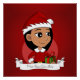 A poster with an illustration of a cute little happy smiling Latina/Hispanic or Asian girl with long black hair, who is dressed in Christmas clothes and is wearing a red Santa Claus hat and holding a present; Christmas holidays design on a red background, with an editable text template for your name or message