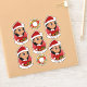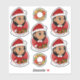 Set of seven cut-vinyl stickers with an illustration of a cute little happy smiling Latina or Asian girl with long brown hair, who is dressed in Christmas clothes and is wearing a red Santa Claus hat, on a red background; five stickers of the girl and two stickers with a Christmas wreath; with a customizable text template for your name or message
