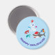 Magnet with cute ocean Christmas theme design. The design consists of a cute shark wearing a Santa hat and carrying Christmas presents, cute green sea turtle and cute red crab. The design is completed by a small white coral arranged as a Christmas tree and decorated with blue, pink and purple seashells and a red starfish. The text says "Happy Holidays!". The design is customizable and you can personalize the text.