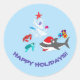 Stickers with cute ocean Christmas theme design. The design consists of a cute shark wearing a Santa hat and carrying Christmas presents, cute green sea turtle and cute red crab. The design is completed by a small white coral arranged as a Christmas tree and decorated with blue, pink and purple seashells and a red starfish. The text says "Happy Holidays!". The design is customizable and you can personalize the text.