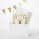 A cute teddy bear dressed like a honey bee. Two bees fly above the text against a background of pretty brown-centered yellow flowers. All text can easily be changed to your information.
