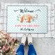 This cute "Hope You like Dogs" welcome doormat features a sweet little dog sleeping in flowers. An elegant script font Welcome and a dotted background add to the charm of this mat. Personalized with your name. Perfect for inside or out.