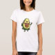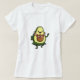 A cheerful cartoon avocado character in a hula dancer outfit. The smiling fruit mascot is wearing a green leaf grass skirt and a vibrant lei made of red and white hibiscus and frangipani flowers while dancing and waving.