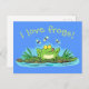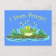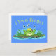 This postcard features a cute hungry green frog staring at some tasty fat flies. All done in happy cartoon style and perfect for sending to any frog fan.