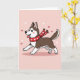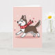 This cute card shows a husky dog trotting across the center on a soft blush-pink background. The dog has dark brown and white fur, wide dark eyes, and an open mouth with its tongue out, giving it a happy, friendly look. A bright red scarf with small white hearts wraps around its neck and stands out against the pink setting. White and deep rose hearts float around the dog, adding a sweet romantic feel ❤️. A slightly darker pink shadow under its paws helps show motion as it moves forward. There isn’t any text printed on the card, so the picture gets all the attention 💌. It feels like a simple way to say “I care about you,” whether it’s for a partner or a good friend 🍫.