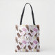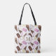 This pretty personalized tote bag features a pattern of yummy ice cream cones, ice pops, and ice cream bars. At the center is your monogram in brown on a violet lined circle banner. Everything is placed on a white background. Cute, and personalized for you! The back of the back has the same image.