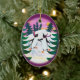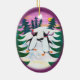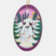 A fun Oval Ornament, with two cute Penguins having fun, ice-skating, in a snowy landscape with fir trees and a setting sun; from a hand-painted paper collage by Judy Adamson.