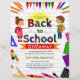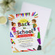 Promote your back to school supplies and backpack giveaway with this cute illustrative flyer design featuring a schoolgirl and schoolboy painting and writing on a colorful typography scribbled script, school supplies border frame, flying airplane, yellow sun, and a paper background. Customize template to your liking.