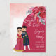 Cute Indian wedding Save the Date invitation card template. Viva magenta color, Indian bridal couple, burgundy roses.