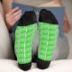 This awesome pair of patterned crew socks features a graphic image of a cute Irish unicorn. The unicorn is bright green with a mane and tail made of two more shades of green. It has a bright gold horn and golden hooves. The unicorn has a gold ringed eye and a friendly smile. There are four small Shamrocks on the side of the unicorn.