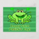A cute green frog for St Patrick's Day. This funny St Paddy's design features a frog with shamrock antennas and shamrocks on its leg, and it's also catching a clover on its long green tongue. The green text says, "Hoppy Saint Patrick's Day." This is an adorable design for anyone who likes animals / animal puns and wants to send a lucky green postcard for St Patty's Day.