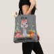 This tote bag features an adorable ostrich who wears a red and white bow and eye glasses behind a row of colorful potted house plants and fruit. The black text above and below the image says "It's an Ostrich Thing". The image and text are placed on a medium gray background on both sides of the bag.