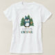 This fun, humorous Christmas holiday shirt features a hand drawn penguin, wearing a hat and scarf in teal blue. He's standing in front of some Christmas trees and holding a gingerbread man cookie. Play-on-words text (a pun) reads, "It's penguin-ing to look a lot like Christmas."