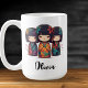 This personalized mug features 3 cute colorful Japanese kokeshi dolls