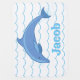 A cute illustration of a dolphin jumping out of the water with waves in the background. Personalize with the name of your choice which will appear in a light-blue font below the dolphin.