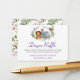 This cute design features a lion, monkey, and a rhino surrounded by a botanical leaf pattern with pink and purple flowers.. This popular typography can be customized to change the color and font style or keep it as it is for your convenience. This card is gender neutral, so it's cute for a girl or boy baby shower.