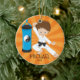 Personalized & Dated Cute brunette boy Karate personalized Christmas Ornament set on an orange background. Visit our shop to view this adorable karate boy in a variety of hair & poses.
