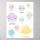 Cute and stylish, this poster is a great way to introduce the solar system to your child at an early age. Features a white background with yellow stars and constellations highlighting all nine planets, yes--even Pluto is represented. Not completely true to size, but still showing size differences for each planet in the milky way galaxy. Great gender neutral gift for astronomy loving parents.