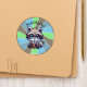 Cute baby raccoon holding a boba or bubble tea Kawaii cartoon. Personalized Sticker. Blue, green and gray background.