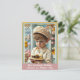Artsy postcard with unique illustration, featuring cute little child handing out various delicious gourmet bites, sweets on a plate.