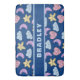 This cute boy's bath mat for a baby nursery bath or kids bathroom feature a dark blue background with hearts, stars, and moons in a baby bedtime theme. Perfect for a baby shower or kids birthday and personalize with a name for a unique touch.