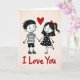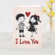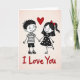 This greeting card shows a cute cartoon boy and girl standing close together and holding hands under a red heart 💘. The background is a soft peachy pink with small, faint hearts scattered around, giving it a gentle Valentine’s Day feel. The boy has spiky black hair, closed eyes, and a big smile, and he’s wearing a striped shirt. The girl also has her eyes closed and is smiling, with a red bow in her hair and a red dress with small dots, and she lifts one foot like she’s happily posing. Above their hands, the bright red heart floats between them, like it’s marking their connection. Near the bottom, the words “I Love You” appear in thick red letters that stand out clearly against the light background ❤️. It’s a simple, sweet design that feels perfect for romance or close friendship, and it’s a lovely way to share Valentine’s Day feelings with someone you care about 😘.