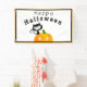 This funny Halloween Party Welcome Banner for kids features a silly and smiling black can sitting on top of a jack o' lantern pumpkin. the text reads "Happy Halloween" in distressed lettering. The welcome banner for Halloween Party has an orange and black border.